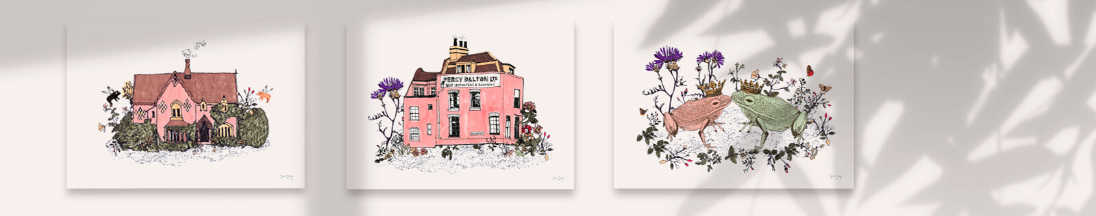 These high-quality giclée art prints perfectly complement the hand-drawn illustrations found in Sian Zeng’s Woodlands wallpaper collection. Enter an imaginarium of magical frogs, hedgehogs, enchanted buildings and flying pigs.