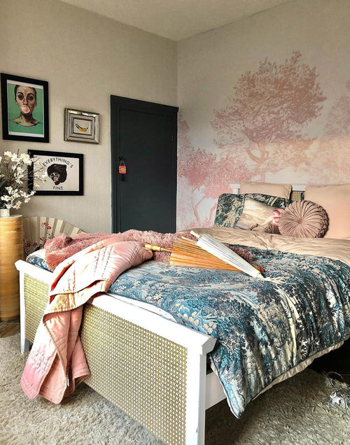 Des motifs de fond d'écran audacieux aux peintures murales calmantes, créez une palette intérieure cohérente et un style avec ces idées de mur de chambre chic.
